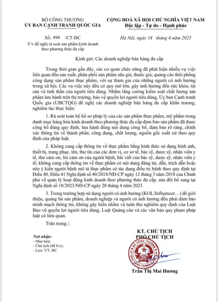 [ỦY BAN CẠNH TRANH QUỐC GIA] Thông báo Doanh nghiệp bán hàng đa cấp rà soát sản phẩm kinh doanh theo phương thức đa cấp